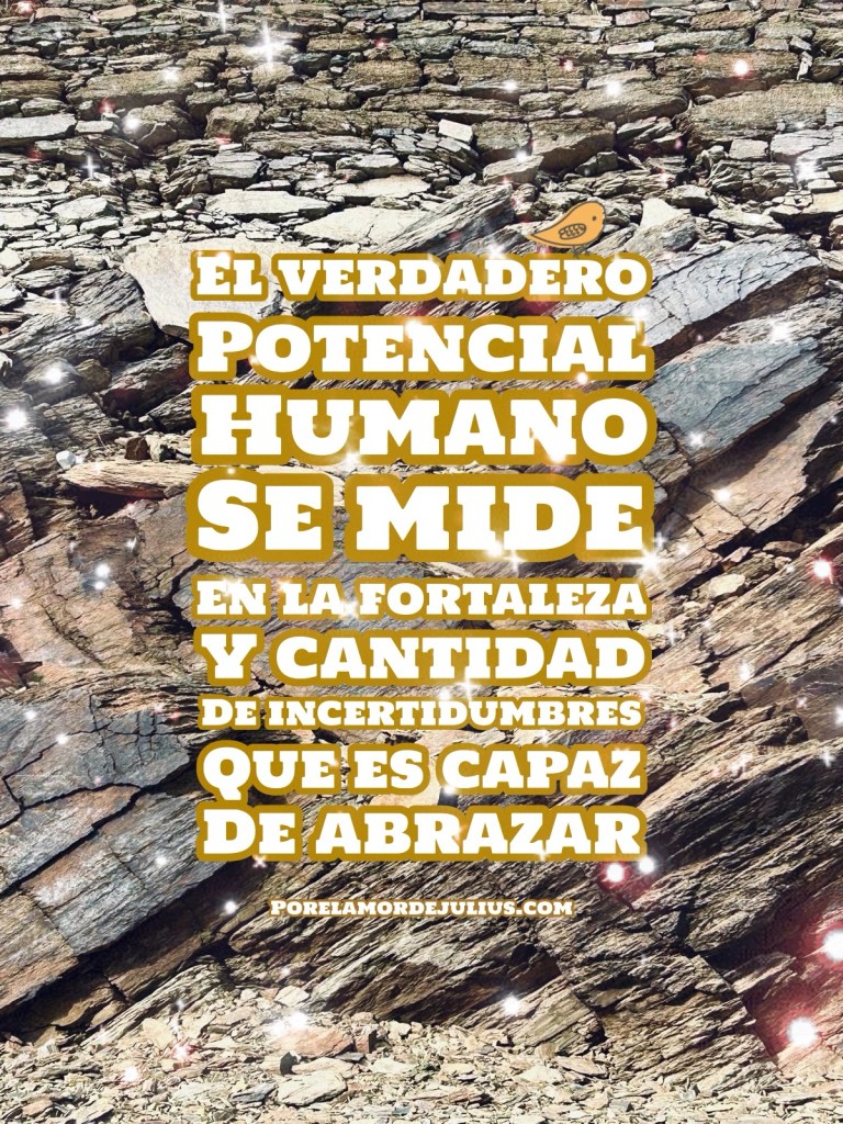 “El verdadero potencial humano se mide por la fortaleza y cantidad de incertidumbres que es capaz de abrazar”, es una reflexión profunda sobre la verdadera medida del potencial humano, sugiriendo que no reside en la capacidad de manejar la certeza o el conocimiento absoluto, sino en la fortaleza mental y la capacidad de navegar la incertidumbre, aceptar la falta de respuestas claras y adaptarse a la complejidad y prosperar en la ambigüedad del mundo, lo que fomenta la resiliencia y el crecimiento-desarrollo personal y profesional.