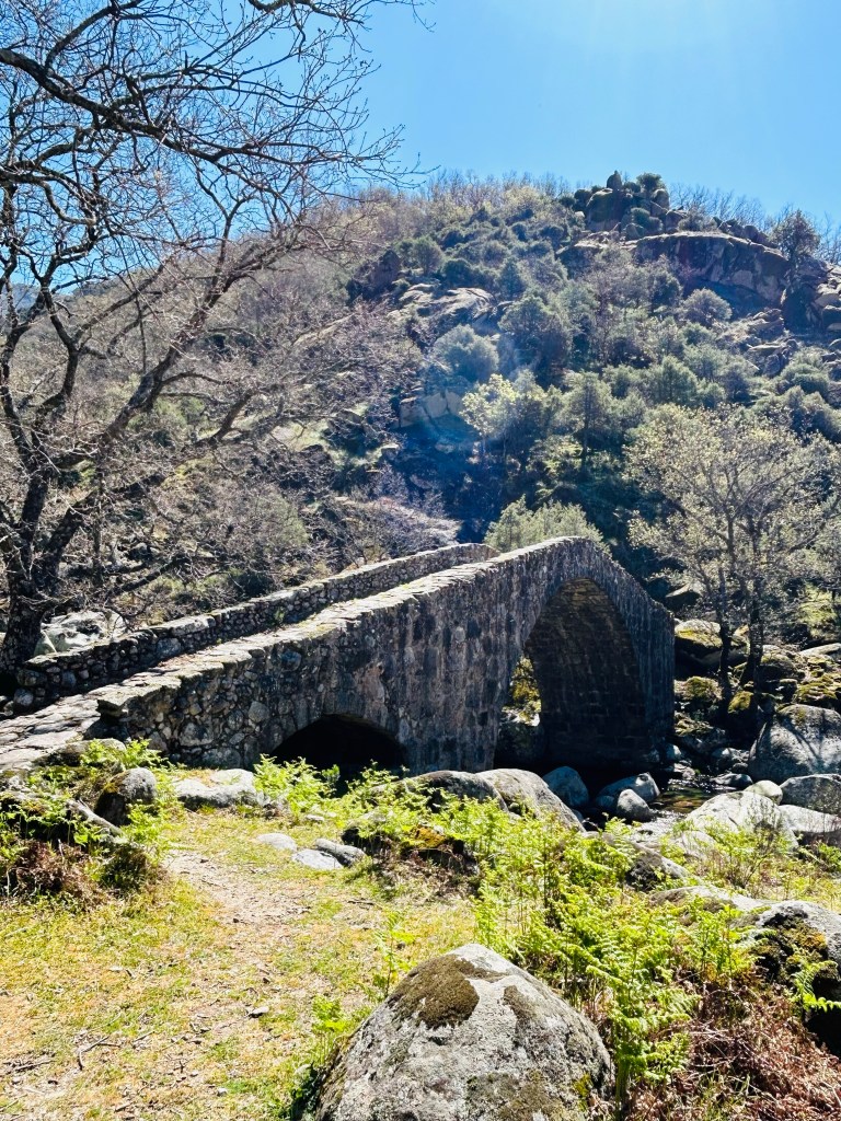 Al llegar al Arroyo Castañero, encontramos dos formas de cruzarlo: el curioso puente de cuerdas (mono) o el puente de piedra.