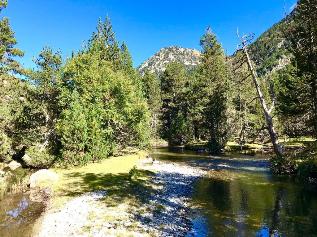 En esta ruta el agua es protagonista en todo momento: en el Planell de Aigüestortes el río pierde su fuerza y juguetea por entre prados y bosques de pino negro.